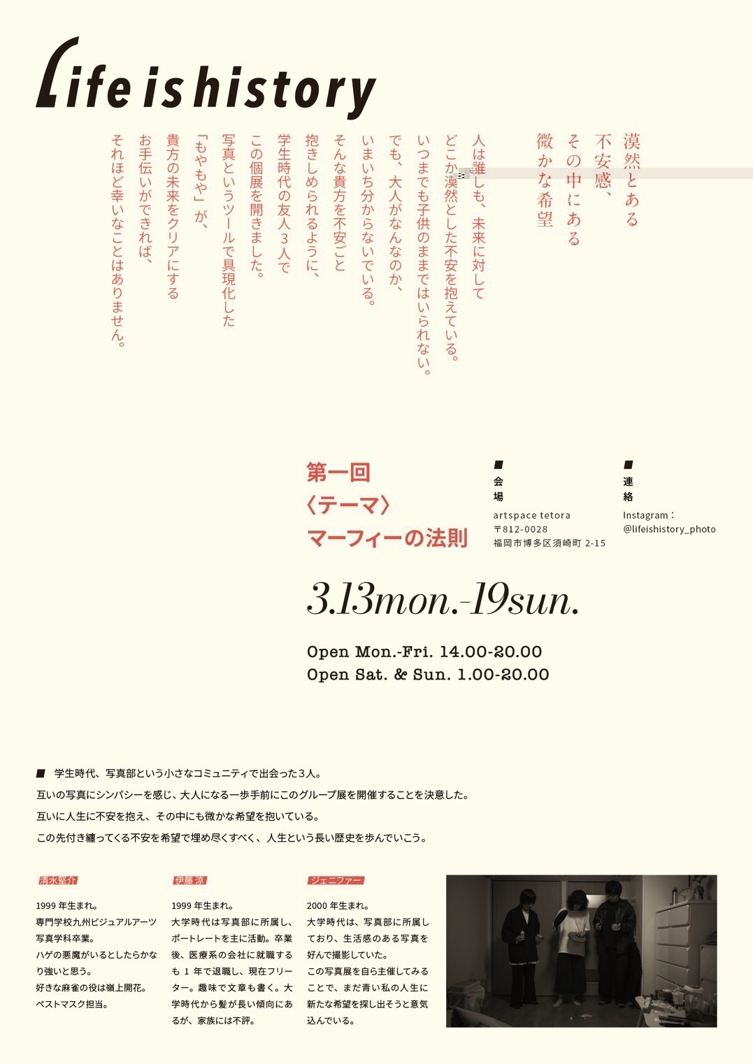 人は誰しも、未来に対してどこか漠然とした不安を抱えている。いつまでも子供のままではいられない。でも、大人がなんなのか、いまいち分からないでいる。そんな貴方を不安ごと抱きしめられるように、学生時代の友人3人でこの個展を開きました。写真というツールで具現化した「もやもや」が、貴方の未来をクリアにする、そのお手伝いができれば、それほど幸いなことはありません。